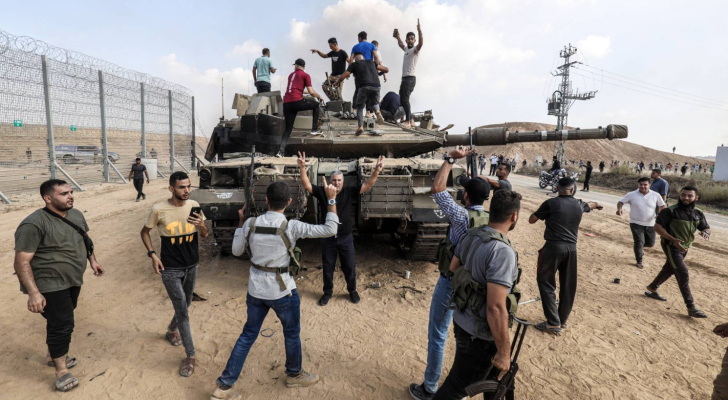 فلسطينيون يعتلون دبابة للاحتلال مع انطلاق طوفان الأقصى