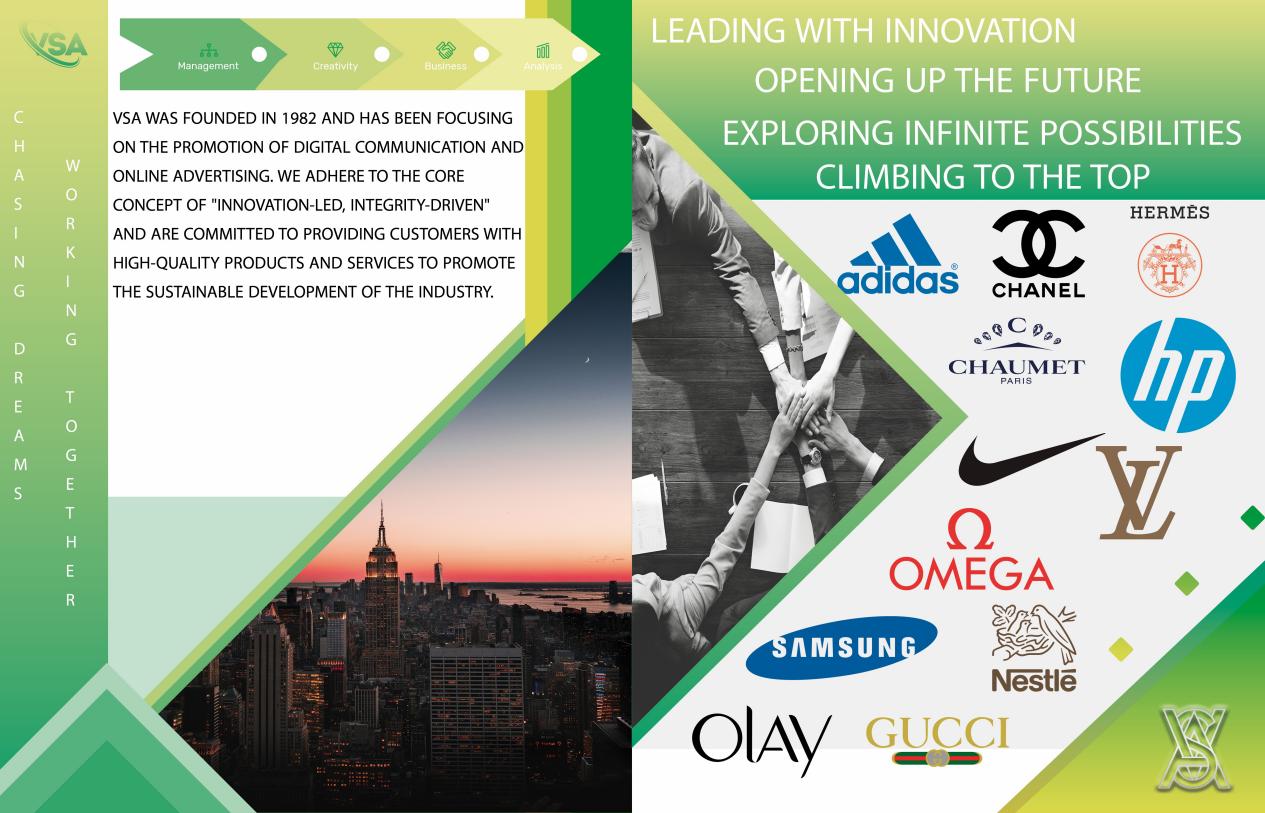 منذ تأسيسها في عام 1982، ركزت VSA على تعزيز الاتصالات الرقمية وأعمال الإعلان عبر الإنترنت. على مر السنين، كنا نلتزم بالمفهوم الأساسي المتمثل في "الإدارة القائمة على الابتكار والنزاهة"، ملتزمين بتزويد العملاء بمنتجات وخدمات عالية الجودة وتعزيز التنمية المستدامة للصناعة.